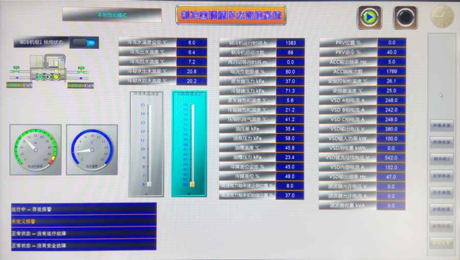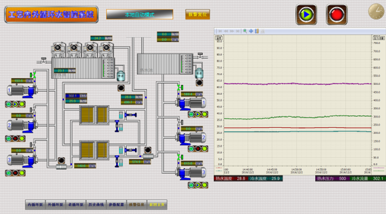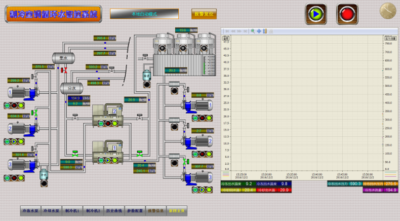 此項(xiàng)目采用西門(mén)子S7-300 PLC控制系統(tǒng)和分布式IO控制站、WinCC上位機(jī)監(jiān)控采集系統(tǒng),充分運(yùn)用優(yōu)化的邏輯控制流程,并通過(guò)數(shù)字控制算法,調(diào)節(jié)各變頻泵、變頻冷水機(jī)組、電控調(diào)節(jié)閥,保證機(jī)組、水泵、冷卻塔投用及切換充分合理優(yōu)化,同時(shí)又能快速穩(wěn)定地響應(yīng)全部試驗(yàn)間、生產(chǎn)車(chē)間在全范圍內(nèi)的負(fù)荷切換和波動(dòng),保持環(huán)境空調(diào)冷水、工藝試驗(yàn)冷水、燃油冷水的工藝參數(shù)穩(wěn)定。在保證生產(chǎn)試驗(yàn)要求的基礎(chǔ)上實(shí)現(xiàn)經(jīng)濟(jì)節(jié)能運(yùn)行控制。