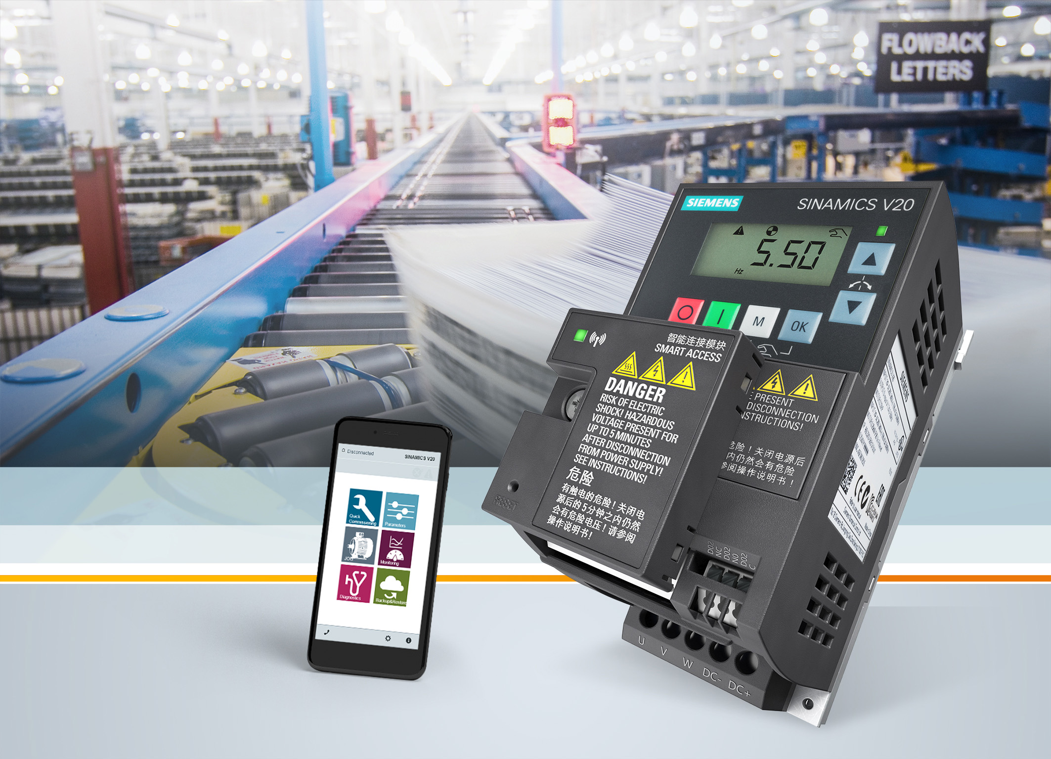 西門子Sinamics V20系列變頻器新增了一款無(wú)線調(diào)試和運(yùn)行選件。作為一個(gè)網(wǎng)頁(yè)服務(wù)器模塊,“Sinamics V20 Smart Access智能連接模塊”是一個(gè)小型移動(dòng)接入裝置,它可安裝在變頻器上,成為一個(gè)接入點(diǎn)。用戶可以使用手機(jī)、平板電腦、便攜電腦或其他移動(dòng)設(shè)備,通過(guò)加密的WIFI連接,訪問(wèn)V20變頻器,進(jìn)行快速調(diào)試、參數(shù)設(shè)置或監(jiān)控。這樣,即使其安裝在難以接近的位置,用戶都可以隨時(shí)利用熟悉的工具方便地連接變頻器。該模塊具備直觀易用的用戶界面,可通過(guò)調(diào)試向?qū)нM(jìn)行快速便捷的調(diào)試。Sinamics V20變頻器是目前市場(chǎng)上最小的變頻器,適用于紡織、包裝、食品與飲料、物流、暖通空調(diào)等行業(yè)。